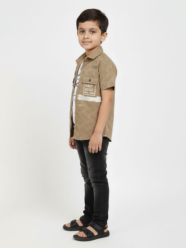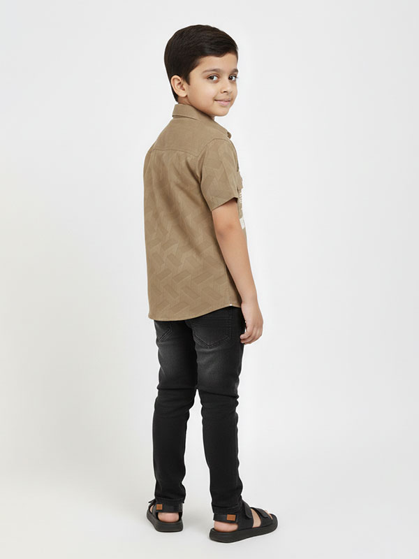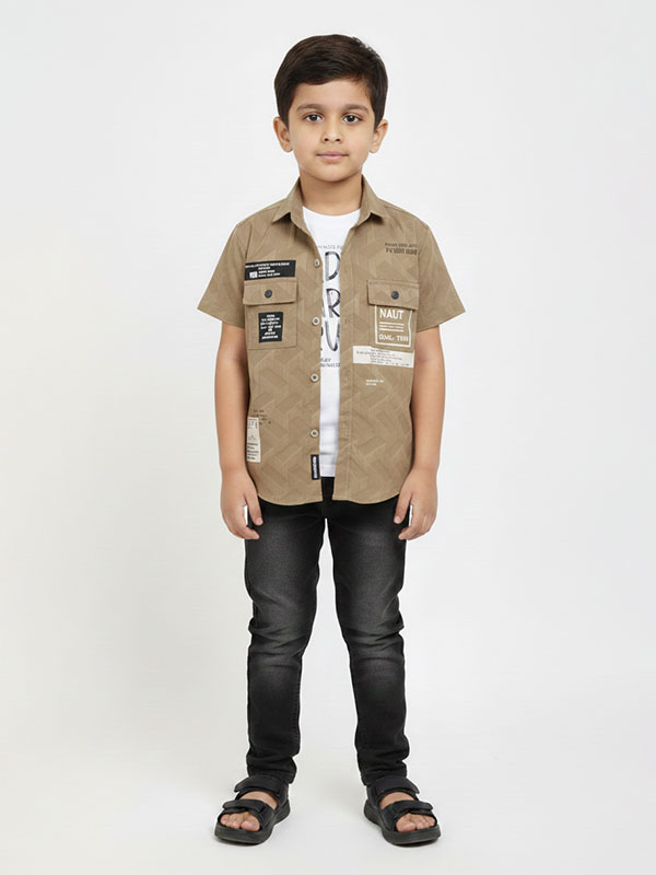 Upgrade his street style with our Boys’ Geometric Textured Utility Shirt. This isn’t just a standard button-down; it’s a high-fashion piece designed for the modern young trendsetter. Featuring a unique 3D-effect diamond weave and tactical-inspired graphics, this khaki tan shirt brings a rugged, urban edge to any outfit.