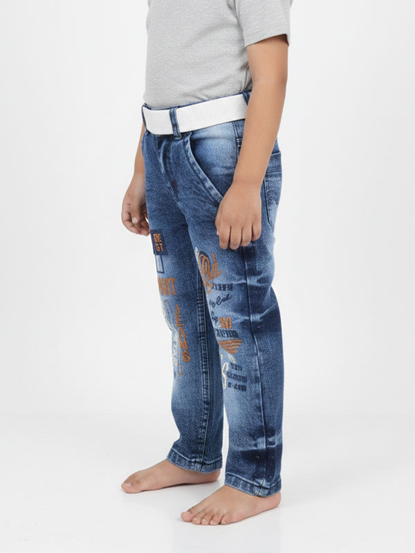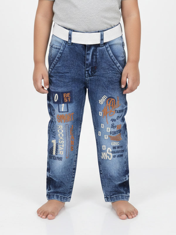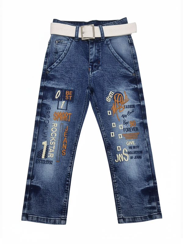 The standout feature is the unique multicolor typography and street-style graphics, featuring “Rockstar,” “Smart,” and “Brooklyn” motifs that give these jeans a modern, edgy look. To complete the outfit, we’ve included a contrasting white webbed belt with a sturdy silver-tone buckle, ensuring a secure and adjustable fit for growing kids.