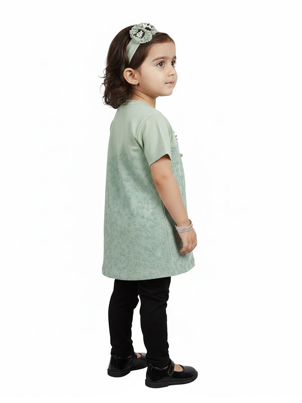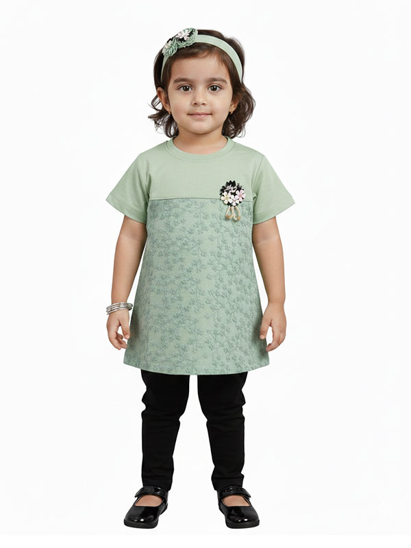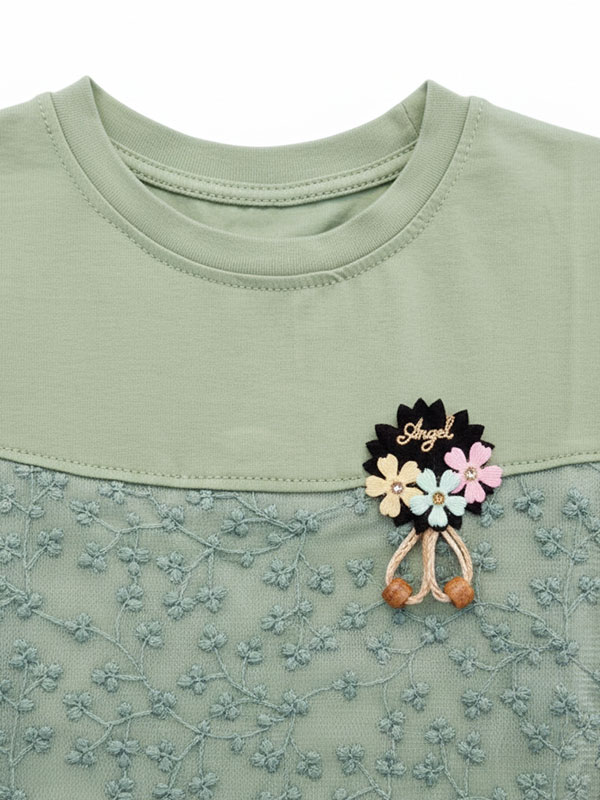 Girls’ Sage Green Floral Lace Tunic – Short Sleeve Embroidered Top with 3D “Angel” Brooch Accent